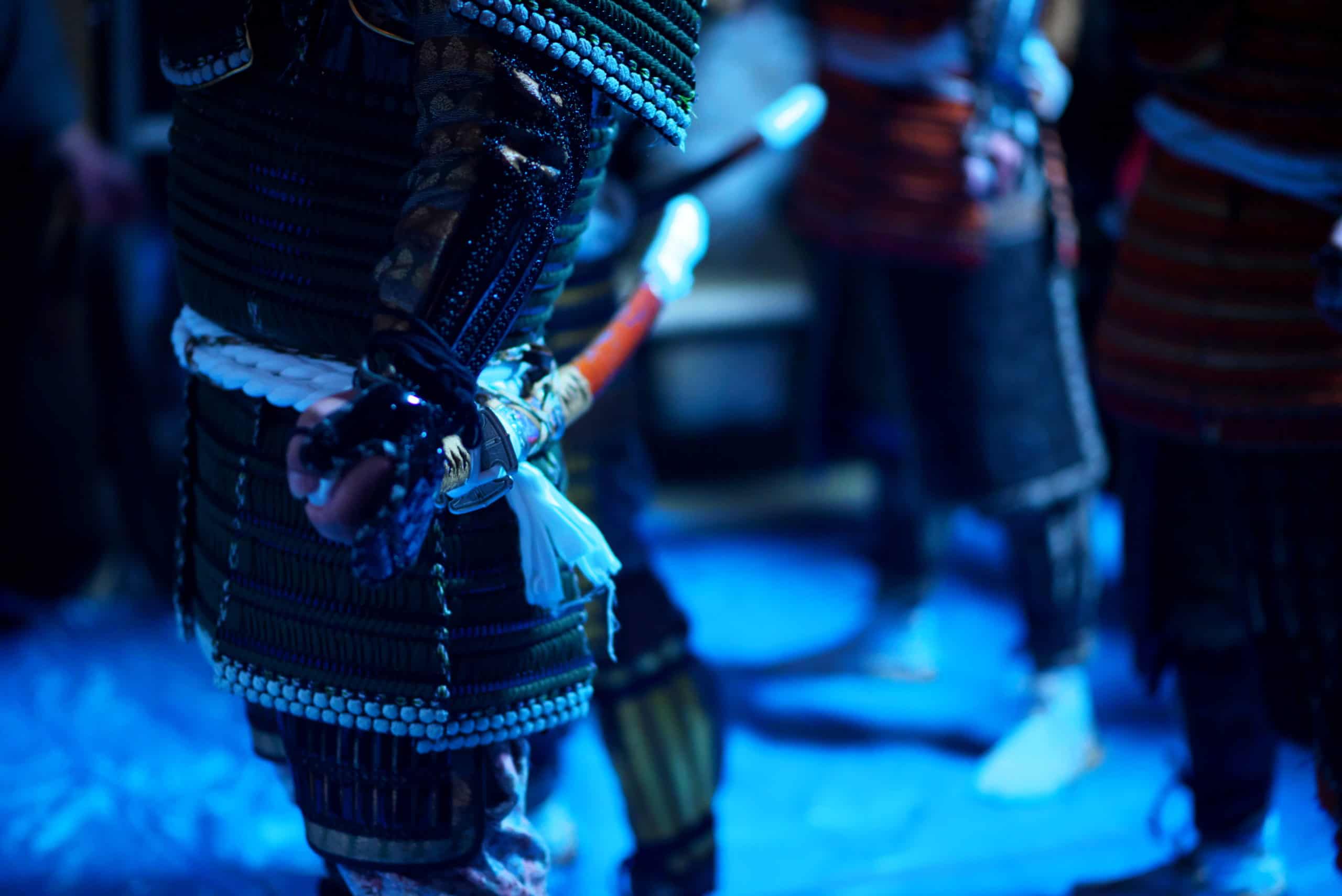 Statue of an ancient Japanese with drawn sword in hand, against the blue sky.